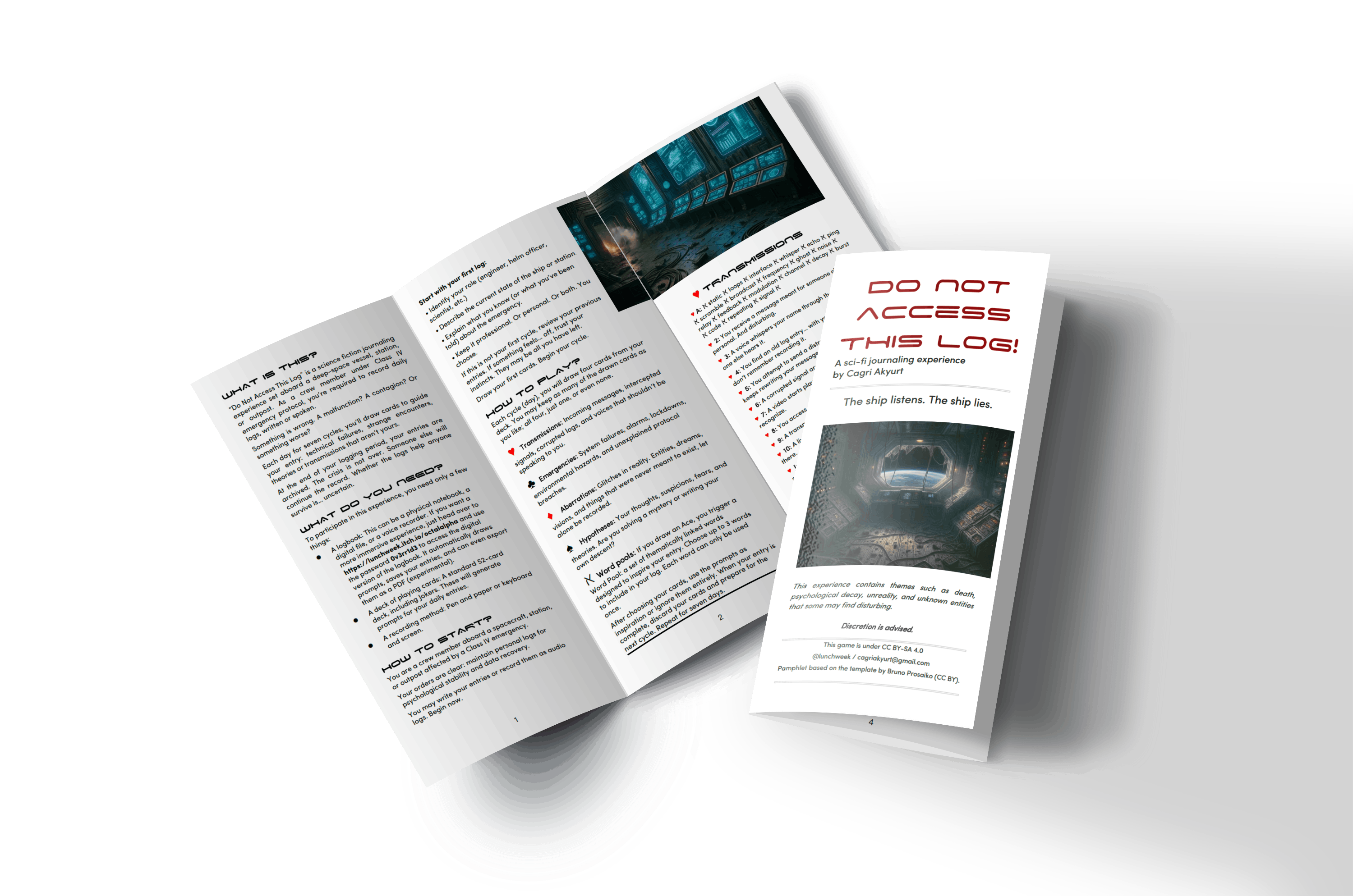 “Do not access this log!” is a solo journaling RPG — a sci-fi reimagining of the original horror experience Do not read this journal!. This time, you’re a crew member trapped aboard a failing deep-space vessel, station, or outpost, required to keep personal logs — written or recorded — under emergency protocol.